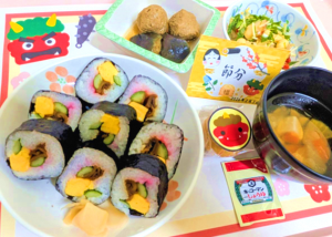 献立(常食)◆太巻き寿司、つみれの煮物、豆サラダ、けんちん汁、節分饅頭